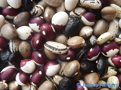 Gemisch aus 5 ursprünglichen Indianersorten aus Peru. Kerne rot-weiß, beige-schwarz, weiß-blau-grau marmoriert, dunkelblau und schwarz.
