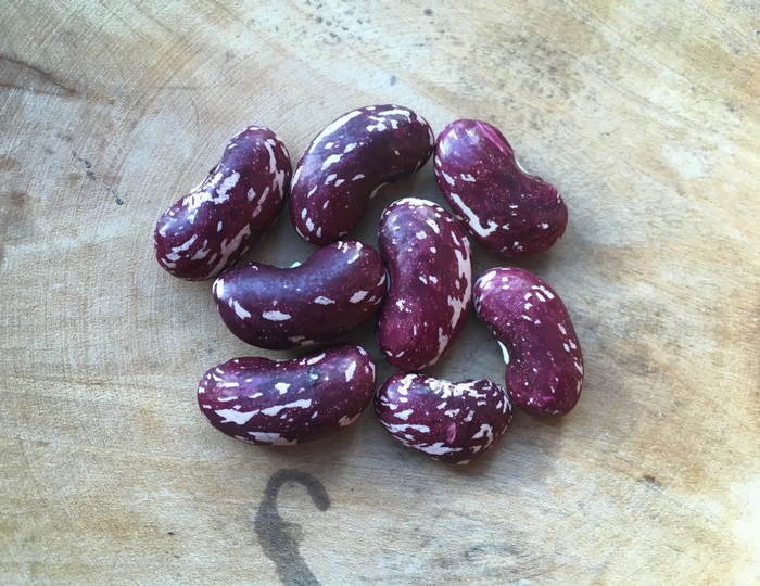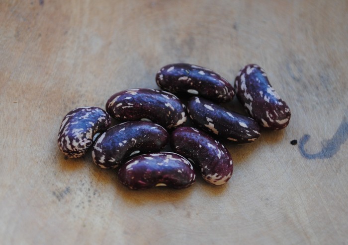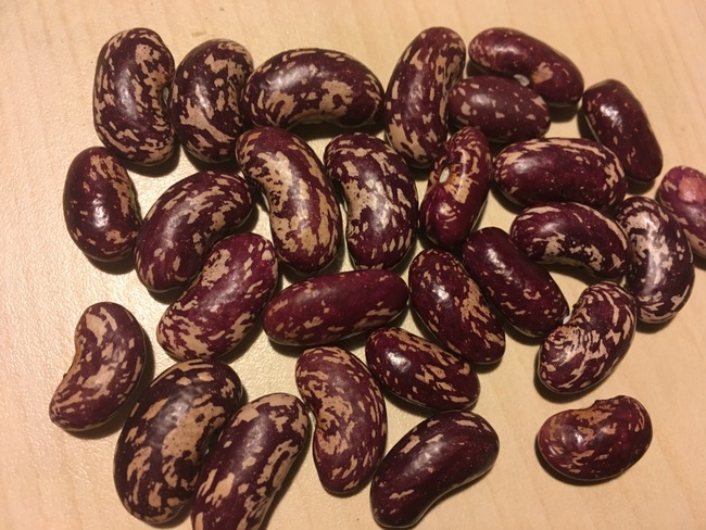 30 cm hoch; kaum fädig, gute Fisole; zierlicher Wuchs; chlorotische Blätter; frühe Bohnen; weiße Blüten; länglich rosa Kerne mit roten Sprenkel; gerade lange Schote; aus Afganistan