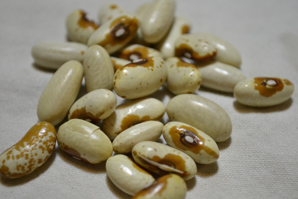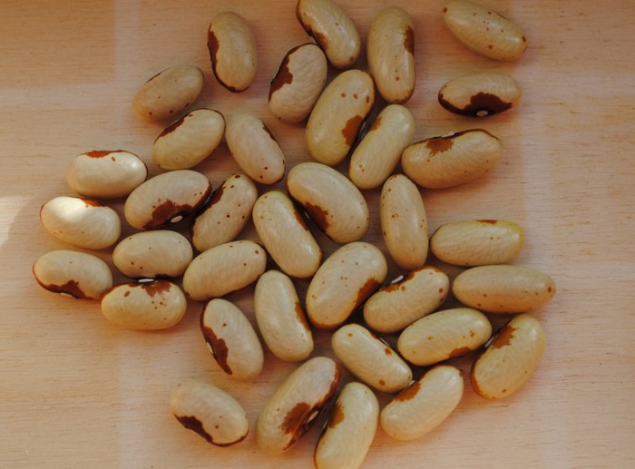 Fisole - Eine weiß blühende Buschbohne mit hübschem Korn: cremefarbener Grundton mit heller ockergelber (später braune) Zeichnung um den Nabel. Verstreut in der Grundfarbe findet man einzelne kleine, doch unterschiedlich große ockergelbe Punkte. Das Korn misst etwa 16 x 7 mm.