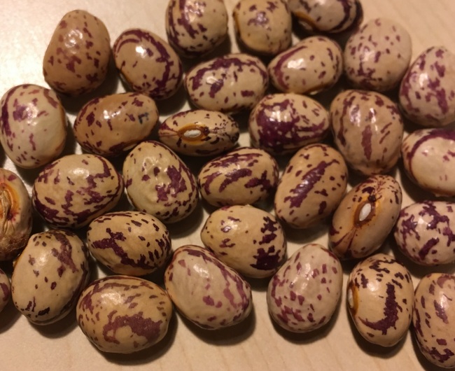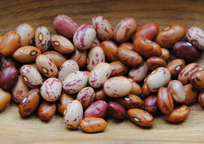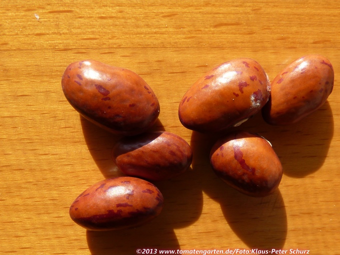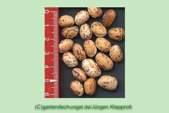 Trockenbohne - Es können bei dieser „Feuerzungen-Wachtelbohne“ sowohl die jungen Hülsen besser aber die trockenen oder (ideal) halbreifen Bohnenkerne gekocht verwendet werden. Besonders schön ist die (in der Sonne!) rot geflammte Zeichnung der Hülsen, welche die Sorte fast zur Zierpflanze macht. Letztere sollten aber bei Nässe (Dauerregen im Frühherbst) nicht auf dem Boden aufliegen, da sie sonst faulen (stäben). Korn sehr dick (bis 17 x 10 mm), eiförmig, meist runzlig und verschieden intensiv geflammt, manchmal sogar fast rot.