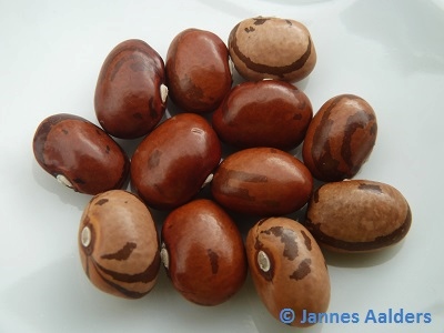 Korn oval, mehrfarbig (cremefarben + hellbraun), gefleckt + gestreift. Verwendung als Grünbohne und Trockenbohne. Mittelspäte Reife.