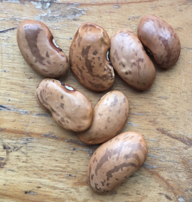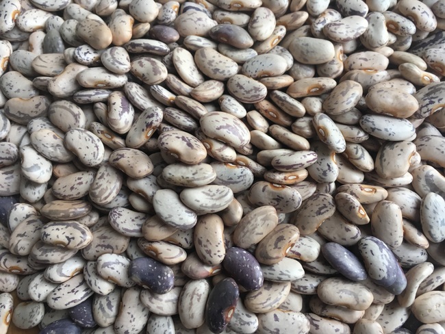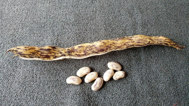 Cremefarbene Samenschale, gefleckt. Verwendung als Trocken-Körnerbohne. Frühe Reife.