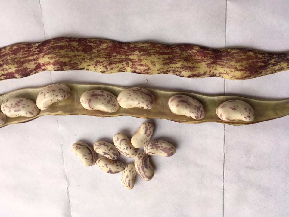 SEHR ertragreiche Bohne welche bei mir recht früh reif wurde. Etwas tickreich...man erkennt nicht vom Augenschein her, man mus die Schote wirklich anfassen. im Grünen Statium sehr schön gefärbt dunkelgrün und tief Lila. Frisch Geerntet ist die Bohne sehr hell mit hellen lila Streifen.