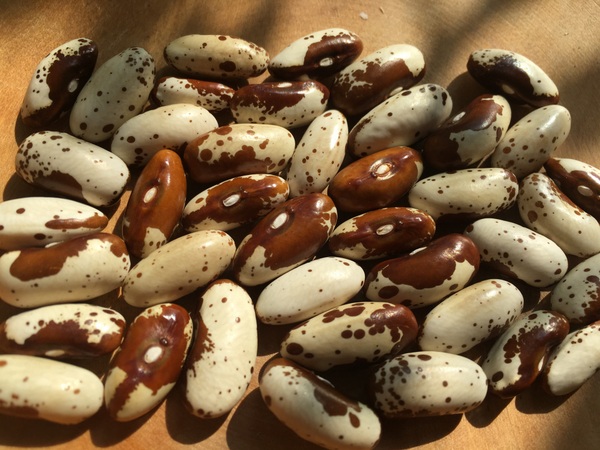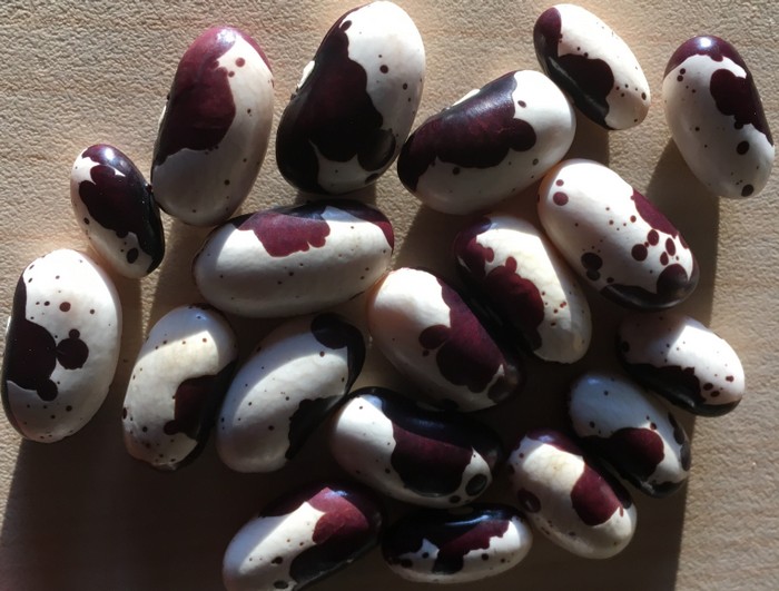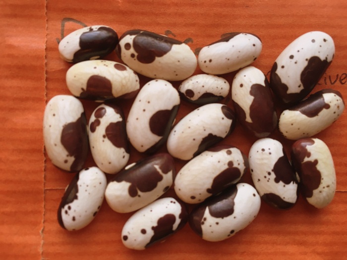 Bush / trocken. Blüte hellrosa Anfang 80 Tage bis zum ersten Trocknen der Hülsen. Seedcoat-Farbmuster ähnlich wie bei Jacob's Cattle, außer in Braun und Weiß anstelle von Braun und Weiß. Die Menge der weißen Fläche des Saatguts kann je nach Wetterbedingungen von Saison zu Saison variieren. Der Bodentyp beeinflusst auch den Farbausdruck der Saatschicht.
