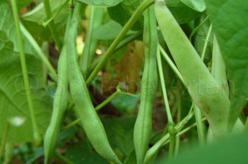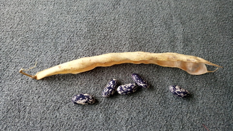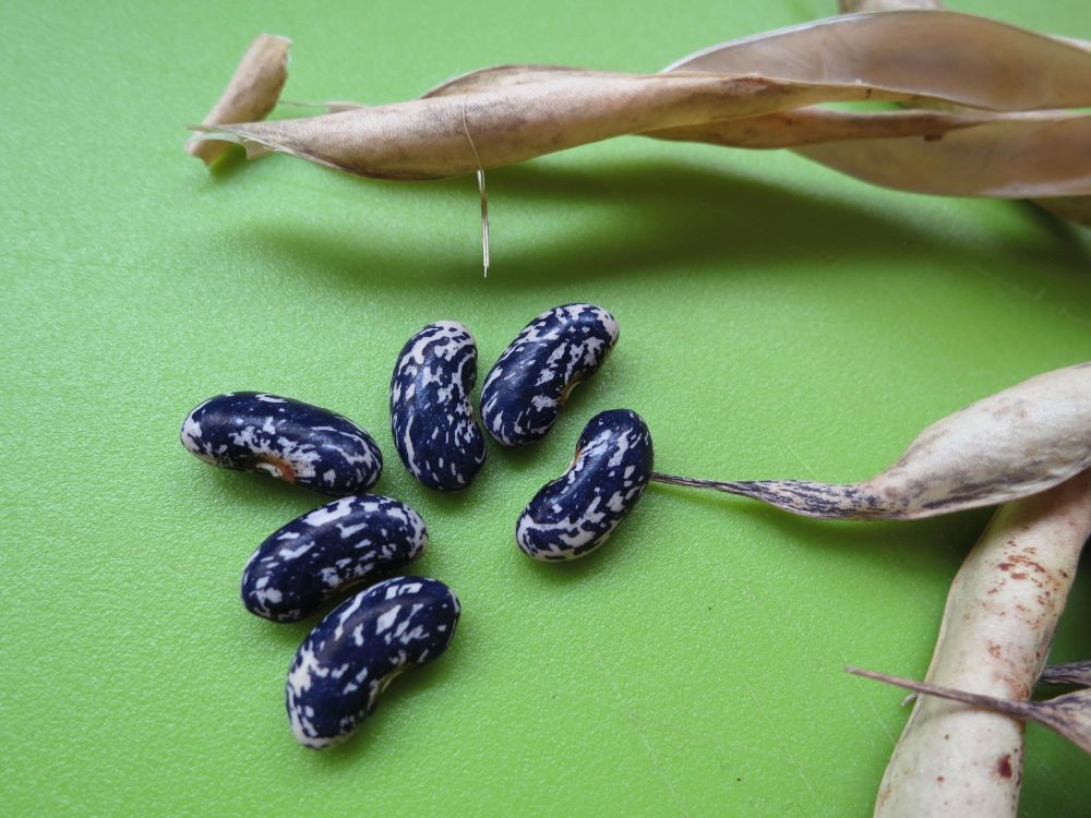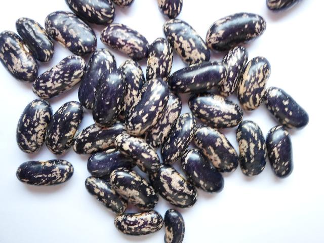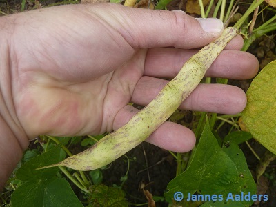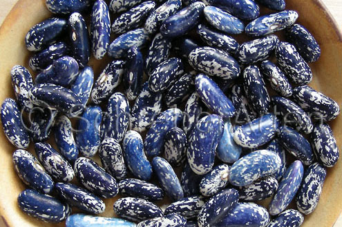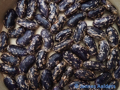 Buschbohne; teilweise hoch wachsend und leicht rankend; braucht leichte Stützen; Relativ große, blau gesprenkelte Körner. eher spät reifend; Nur sehr jung als Grünbohne zu verwenden, später als Körnerbohne.