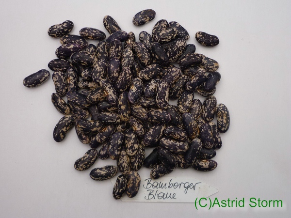 Die Bamberger Blaue hat Herr Watschtong von einer Bäuerin, die sie auf dem Markt in einem großen haufen bunter Bohnen anbot. Er kaufte sich ein Kilo Bohnen und selektierte die Blauen heraus. Im ersten Jahr hatte er auch noch andere dieser Mischung im Anbau, hat sich dann aber auf diese eine blaue Farbe konzentriert, da dies recht selten vorkommt.