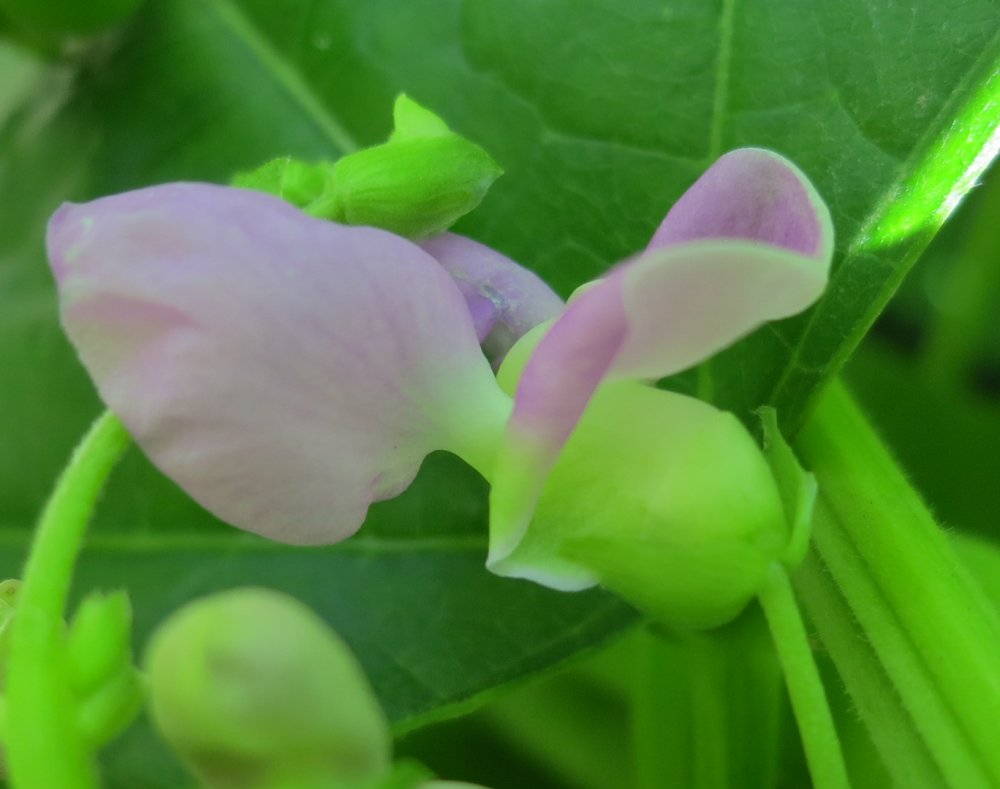 Hülse grün mit Nebenfarben, 15 cm lang, 1 cm breit, spitzes Ende, 4 Samen pro Hülse.
