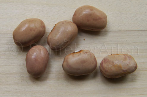 Eine Sorte mit dicken, großen Samen von rosa-beigebrauner Farbe und nur schemenhaft erkennbarer dunklerer Zeichnung. Die dicken, etwa 12 langen Hülsen sind rotviolett geflammt. Ertragreiche Sorte.