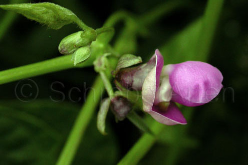 Kleine dickliche schwarze Samen mit weißem Nabel. Ursprüngliche Sorte, deren Hülsen leicht aufspringen. Aus Mittel-/Südamerika. Die Hülsen enthalten 6 Samen und haben eine leichte rote Flammung.
