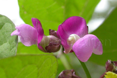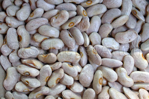 Eine Sorte zur Ernte der Hülsen. Die nierenförmigen Samen sind platt und leicht schwarz gesprenkelt.