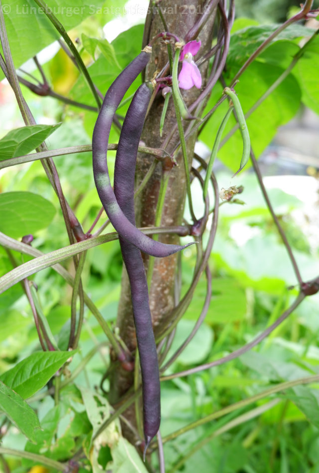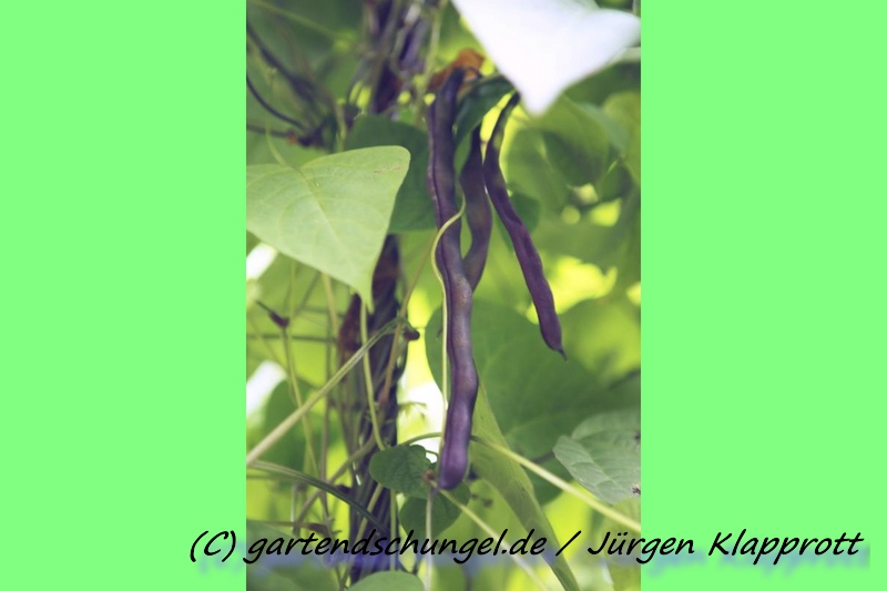Wunderschöne dunkelviolette Hülsen, die man gut im Bohnendickicht findet.