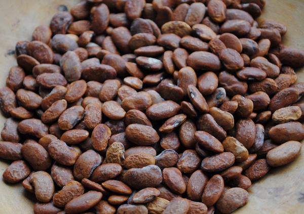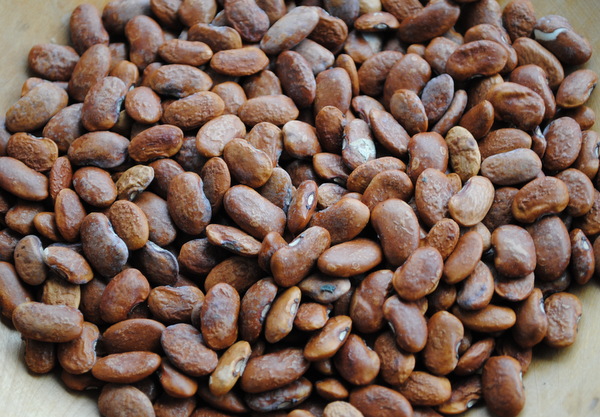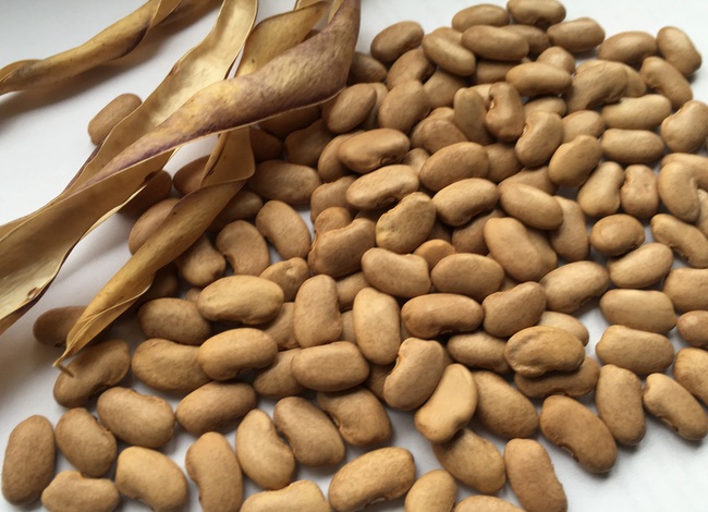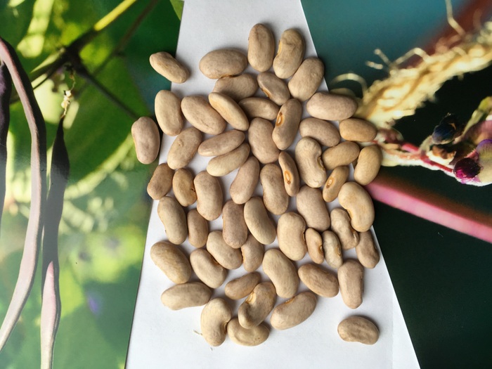 mittelspäte Stangenbohne; Hülsen bis 13 cm lang; ca, 7 Korn/Hülse; Korn hellbraun, nierenförmig; sehr ertragreich