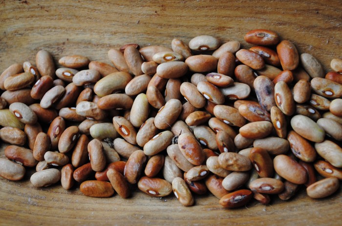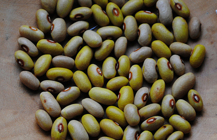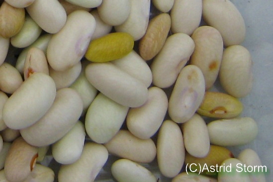 Ein recht ursprünglich wirkendes, sehr kleines Böhnchen mit gelben Hülsen. Um den Nabel ein dunkelbrauner Ring. Aus Dänemark.