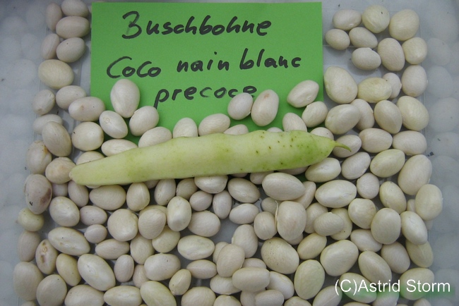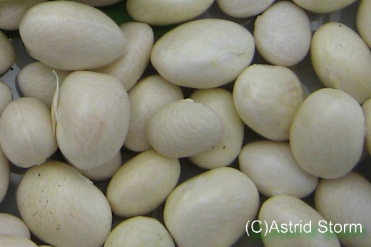Rundliche, weiße Körnerbohne von früher Reife aus Frankreich. Samen etwa 9 x 12 mm. Von Vilmorin S. A., Frankreich.
