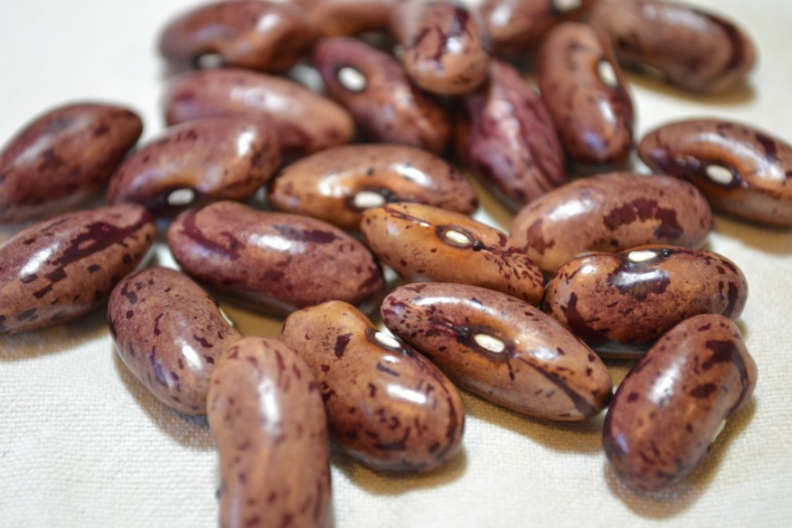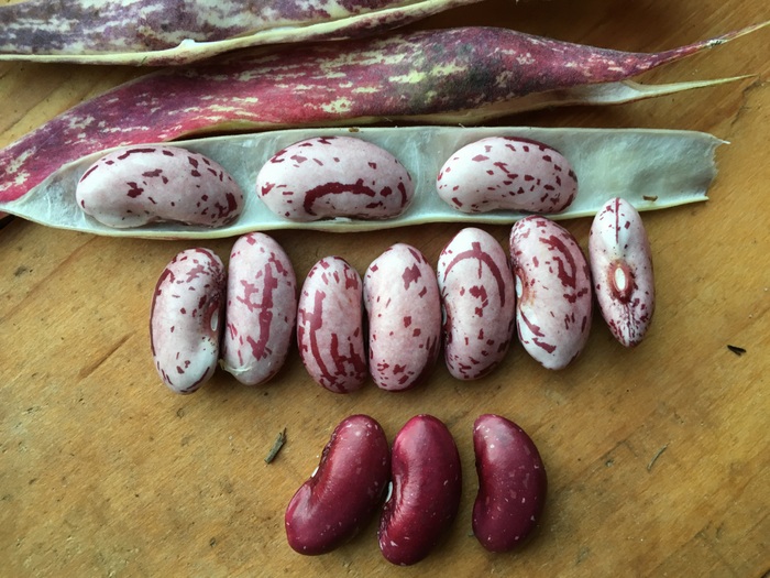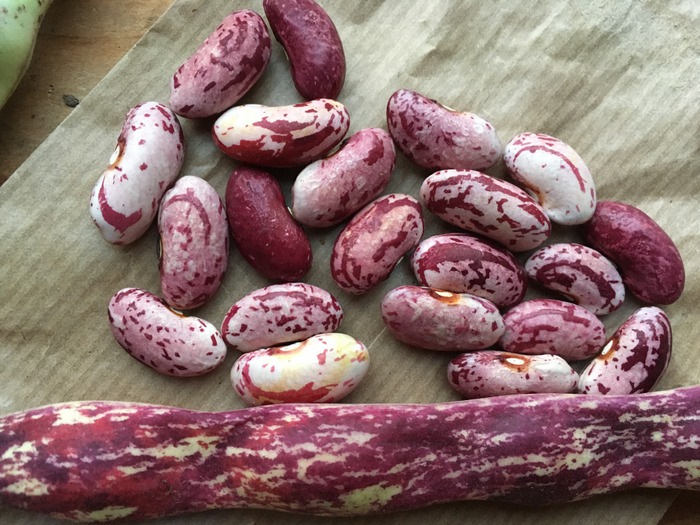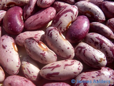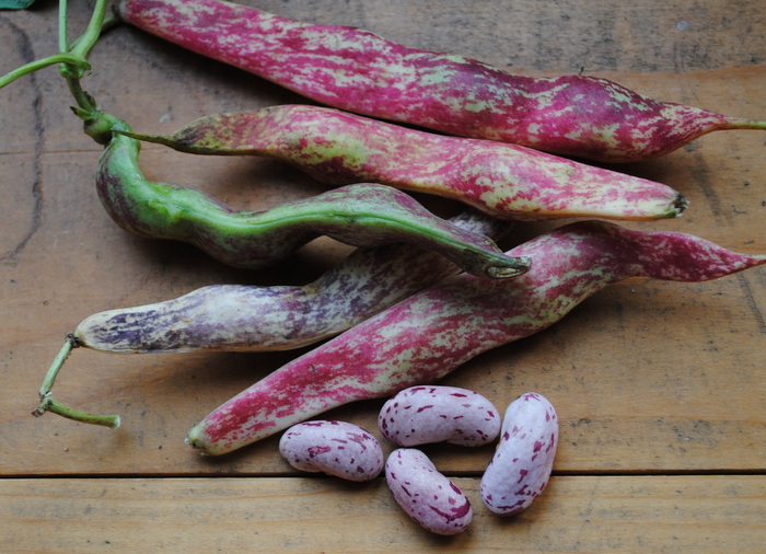 Hochwachsende große rosarote Bohnen mit purpurroten Streifen.