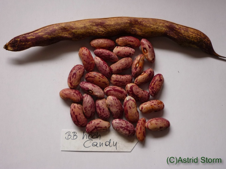 Gering gerkümmte Hülse mit flachem Querschnitt, wunderschön purpurrote und rosa Streifen auf grünem Grund. Länge 16 cm, Breite 1,6 cm, 5 Samen pro Hülse. Keine Einschnürungen an der Trockenhülse. Hülsenende spitz. Längliche Kerne mit flachem Querschnitt, Bauch konkav, rot mit braunen Flecken, groß (100 St. wiegen über 40 g)