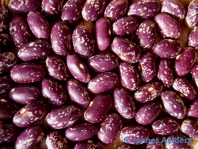 Die getrockneten Bohnen sind lang, und rosa-beige mit dunkelbraunen oder schwarzen Flecken.