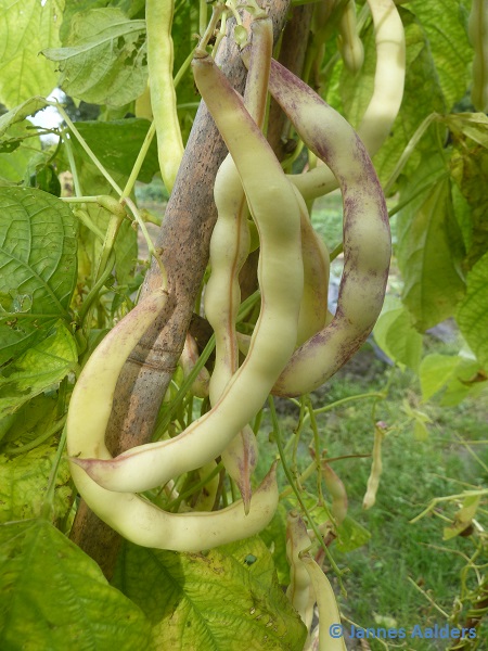 Als grüne Bohne, ist sie gekrümmt und plump, und hat lila Flecken, die verschwinden, wenn wenn sie gekocht wird. 14 bis 15 cm lang sein.