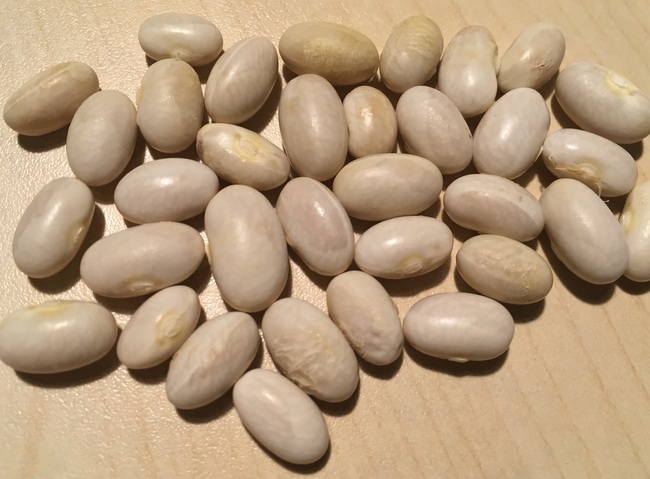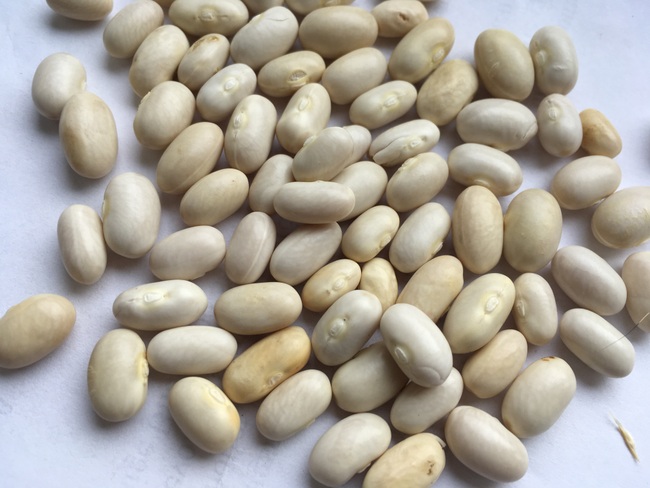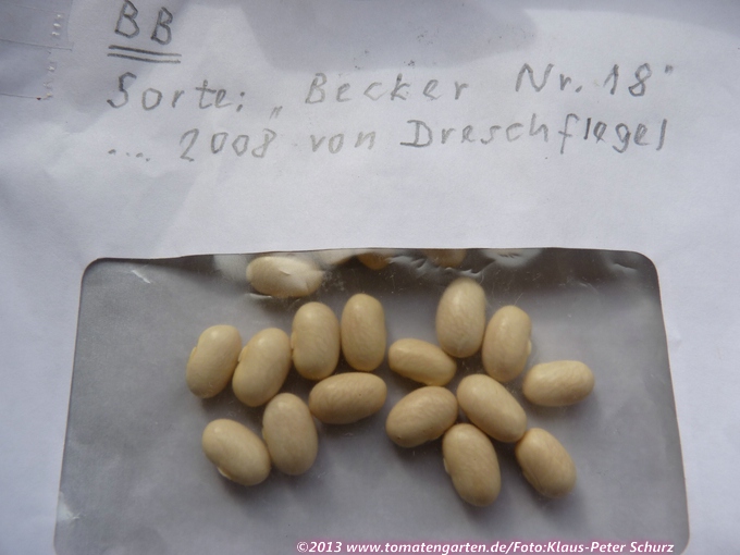 Mit runden, gelben Hülsen. Korn glänzend weiß, eiförmig-oval, 12x6 mm. 25-30 Korn. Von Dreschflegel.