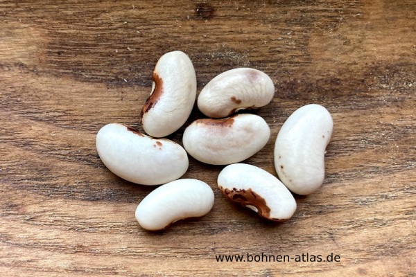 Fisole mit weißen Samen, die um den Nabel die Zeichnung eine fliegenden Taube aufweisen. Die Zeichnung ist heller als bei ähnlichen Sorten und von graubrauner Farbe. Die Samen sind leicht nierenförmig und messen 15x 5mm
