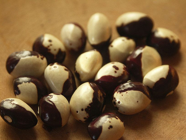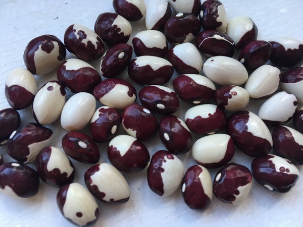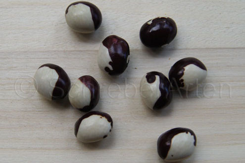 Der größte Teil ist tief weinrot (bei älteren Samen fast schwarz). Etwa 40% sind weiss (gegenüber dem Nabel).