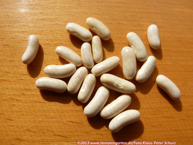 Mit dickfleischigen, fadenlosen, langen (bis 20 cm), grünen Hülsen. Kleines, weißes, langgestrecktes, kaum nierenförmiges, eher tonnenförmiges Korn (13 x 5 mm). Ertrageriche, mittelspäte Sorte von gesundem Wuchs