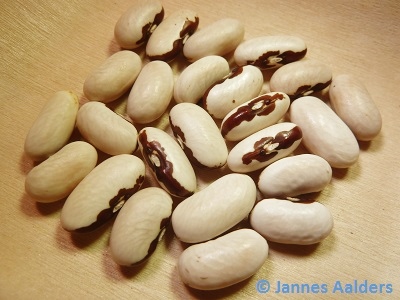Sorte mit länglichen Samen (16 x 5 mm), die am Nabel eine dunkle, rotbraune Zeichnung (fliegender Engel, menschliche Figur) aufweisen. Die Grundfarbe ist weiß und hat manchmal auch einige dunkle Punkte. Dekorative Samen.