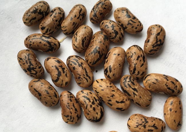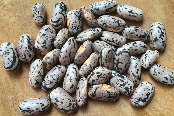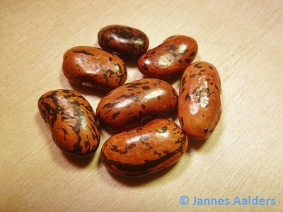 Wohl eher eine Wachtel- und Körnerbohne für den frühen Anbau unter Glas und Folie. Die Samen sind etwa 15 x 5 mm groß, mittelbraun und haben schwarze Sprenkel.