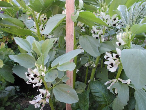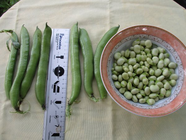 Anbau in 2025: Aussaat 20. 2., Blühbeginn Anfang Mai bei 40 - 70 cm Höhe, 1. Küchenernte am 14.6. bei inzwischen 100 cm Pflanzenhöhe. Die trockene Hülse ist 17 18 cm lang und 20 - 22 mm breit. Das Korn ist beige bei 18-20 mm Länge und 16 mm Breite. Überwiegend waren 3 - 5 Korn je Hülse, vereinzelt auch 6 Korn/Hülse.
