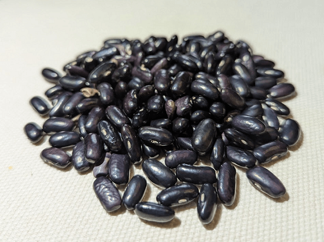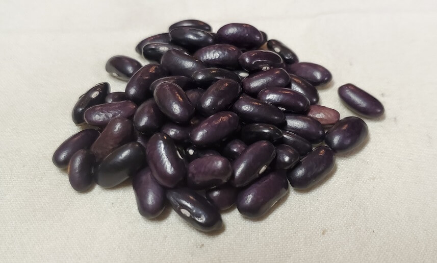 "Pole bean with a strong twining tendency. Solid red vines, dark green leaves. Dark pink flowers. Green pods have a fine purple blush from a young age and yellow as they mature. Round, slightly curved pods have a medium beak. Mature pods average 5" long by 0.4" wide. Standard productivity. Suture string present. Shattering dry pods have a purple blush and average 6-8 seeds per pod. Very good snap bean. Also good as a shelling bean with a nutty flavor. Dry beans have good flavor with a smooth, creamy texture. Small, very dark dry beans. Mid-season maturing. This variety was donated to SSE by Donald Arledge of Alabama, who got it from his cousin, Dusty Ellison. Ellison received the variety from another cousin named Bum Ellison. They say it has been grown by the family of Bum Ellison's wife for at least three generations. SSE Accession # 105707"