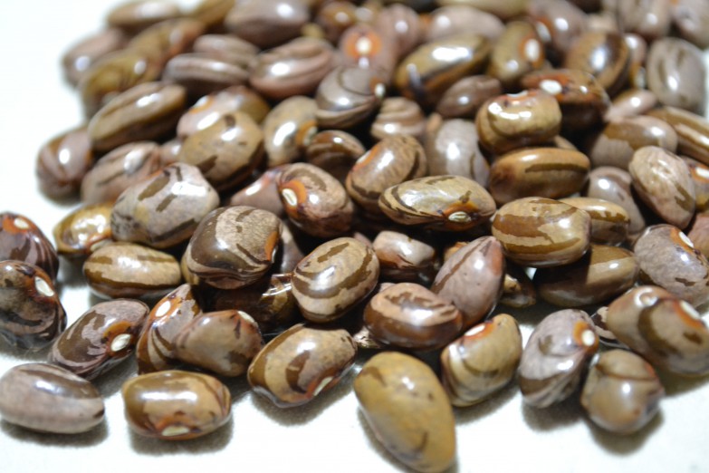 "This is a pink hulled bean with pink seeds until they dry out at which time they turn darker, still with pinkish seeds but with dark brown stripes. It is a quite unique bean."