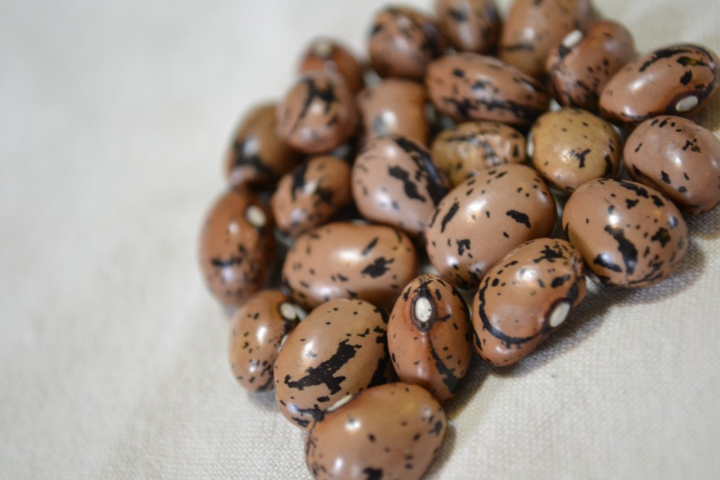 "Mostly purple stubby pods (4-4.5"x1/2x1/2") with huge attractive uniform pale pink seeds with black streaks, like peanut M&Ms, 5/8x3/8x3/8" or lightly larger. Said to be edible as snap when very young. New gardeners requested this seed frequently at an exchange. 40/oz. Similar in appearance to Broughton Astley Polish bean but larger seed, darker streaks and darker pods. 120-150 days to ripe seeds. In long summers with enough rain, does very well."