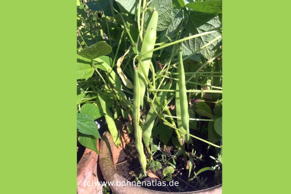 2019 im Kübel gezogen, kam prima mit Kübelpflanzung zurecht. Wüchsige etwas höhere Buschbohne.