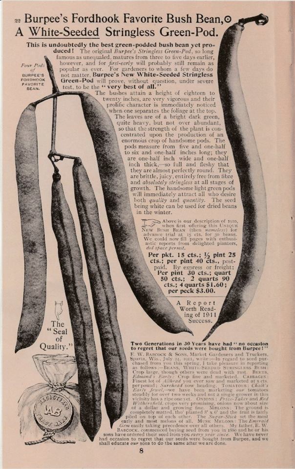 A green bush snap bean with fantastic properties …“ the pods are brittle, juicy, entirely free from fibre and absolutely stringless at all stages of growth.The handsome light green pods will immediately attract all who desire both quality and quantity. The seed being white can be used for dried beans in the winter” (from W.Atlee Burpee seed catalogue anno 1914) This bean was found by John W.Daily * of Falling Waters, West Virginia (USA) in a bed of brown seeded Burpee’s Stringless Greenpod in 1903. The hole historic can be found in “Beans of New York” U.P.Hedrick-anno 1931, p.41 * John W.Daily (1821-****) was a farmer, corn merchant and grain dealer at Falling waters, Berkeley County. The bean ‘Forhook Favorite’ is named after the ‘cultivation and trial fields’ of W.A. Burpee of Philadelphia-USA- = Fordhook Farm) , there are numerous vegetables with Fordhook name : a limabean (‘Fordhook 242’) tomato (‘Burpee’s Fordhook First’) , chard (‘Fordhook Giant Swiss chard’) , pea, pumpkin