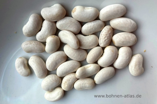 eine langschotige Zucker-Brech-Stangenbohne, ganz ohne Fäden; früh, ausserordentlich volltragend, Schoten ähnlich der Rheinischen Zucker-Brech-, doch etwas schmäler, dickfleischig, zart und zum Einmachen vorzüglich, Bohnen weiss