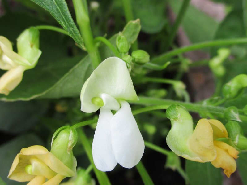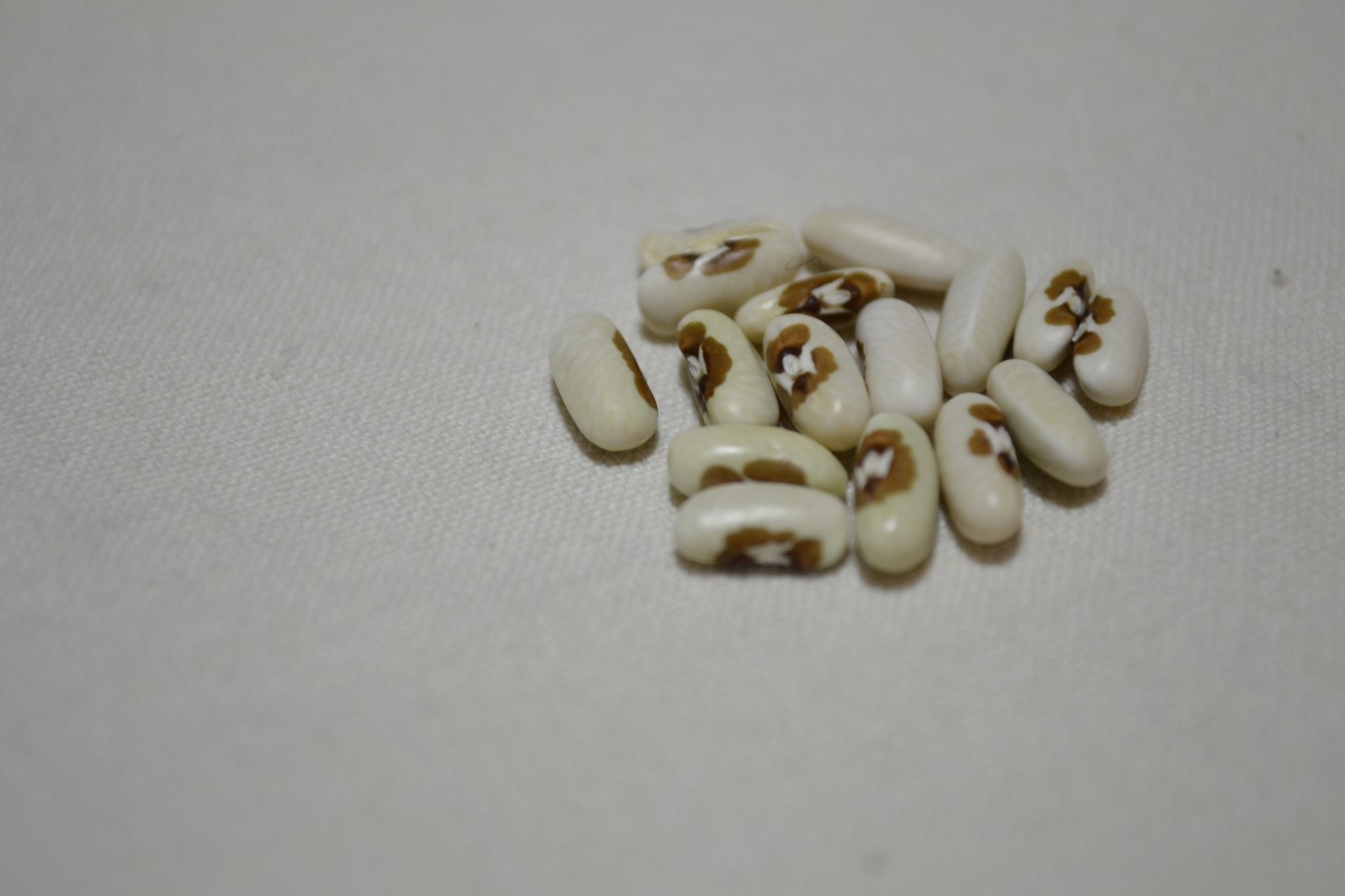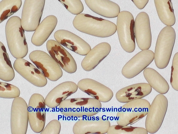 "Dry. Short productive plants grow to about 12 inches tall. First dry pods in about 90 days. A profusion of thin pods. Dry pods are about 5 ¼ x 3/16. Another variety that produces the tiniest of bean seeds which are white with a bird like figure in light brown around the eye. The bird figure was so crisply defined on the seed sample I received, but not on my seed crop this year in ’13. Nine feet of row space produced a half a pound of seed this year in 2013. A fun variety to grow and see. The late Mary Fox would be proud to know her bean legacy still lives on with SSE members. Source History: IN FO M ’12, CV Native Seed Search."