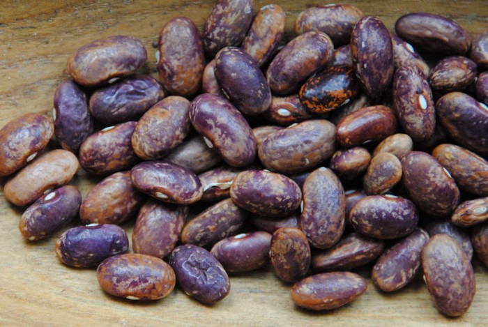 Sehr ertragreiche Stangenbohnensorte mit wein - rot - braun gesprenkelten Kernen.