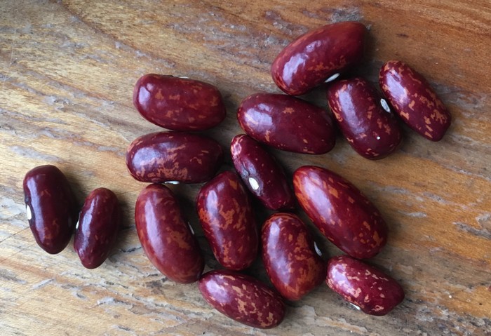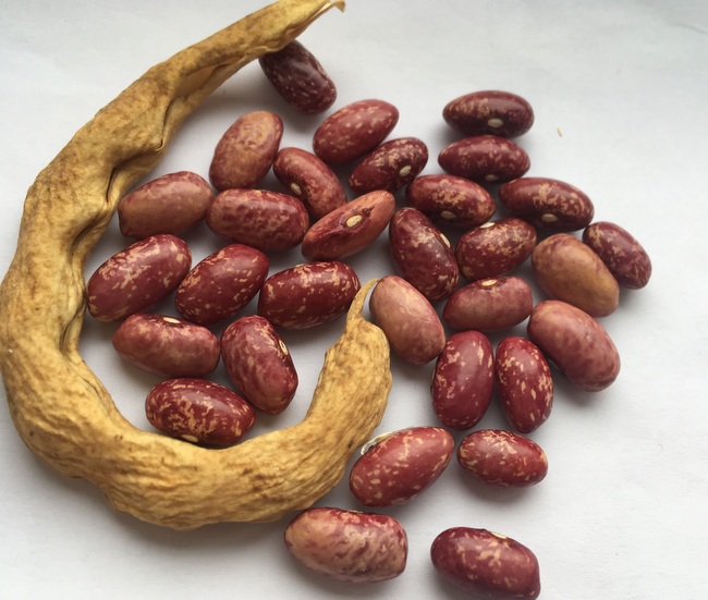 Ein Massenträger mit herrlich rotem Korn (etwas hell marmoriert). Hülsen dickfleischig, knackig, extrem sichelförmig(!) (Tendenz zu 6-er Kipfler, wegen der Form. Identisch?) und total fadenlos. Einfach ein- bis zweimal auseinanderbrechen und kochen. In nassen Sommern und guten Böden lässt sich von einer solitär stehenden Pflanze fast ein halber Eimer Hülsen ernten! Ideal für den Anbau am Spalier. Blüten klein, hellviolett, starker hoher und gesunder Wuchs (3 bis 4 m). Mittelspät bis spät. Wunderschönes kleines Korn: tief satt-leuchtend-rot mit leichter heller Marmarierung, weniger nieren- als tonnenförmig, 14-16 mm lang, 56 mm an Flachseite stark. Nur 3 Korn je Stange erforderlich. Tipp für Massenertrag: 2 Korn/Topf in IV vorziehen, 1-2 x stutzen und dann in V nach Abhärten oder zunächst unter Folie gehalten im Abstand von 50 cm auspflanzen. Eine der schönsten und reichtragendsten Kipflerbohnen.