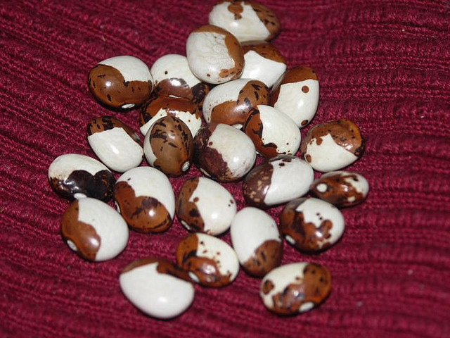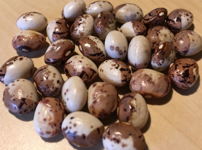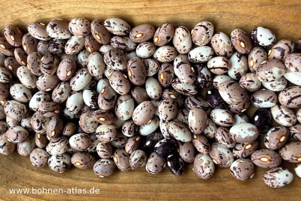 Breite, platte ca. 10 cm. lange, leicht gekrümmte Hülsen mit Borlottityp-Musterung.