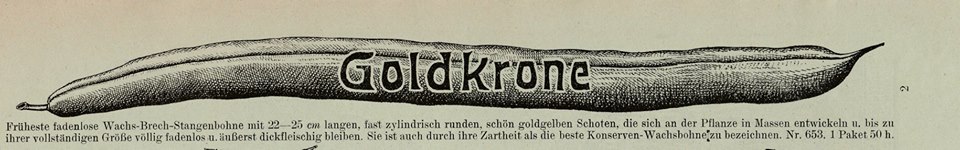 Two pole wax beans with long yellow pods. They were developed around 1913 by the Erfurter (D) Seed Firm Carl Pabst. For these novelties the firm was awarded a medal by the "Vereinigung Deutscher Samenzuchter"