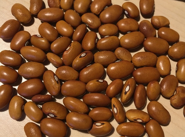 Eine Sorte mit auffallend ockerbraunen Samen (12 x 6 mm) und kurzen, grünen Hülsen. Vermutlich reine Körnerbohne.