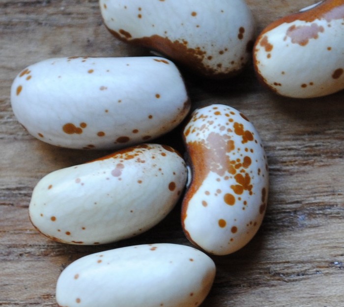 Buschbohne, ca. 60 cm hoch. Die Kerne sind sahneweiß mit dunkelbraunen Flecken unterschiedlicher Größe. Produktiv. Gut an ein kühleres Klima angepasst. Von den Passamaquoddy-indianern in Maine.