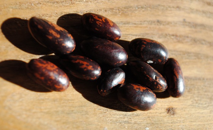 Kräftige, produktive Buschbohne, Schoten enthalten 4-5 große gefleckt bräunlich-lila Samen.