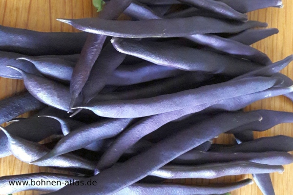 Fisole dunkelviolett, eher flach, sehr lang, wenig Fäden.