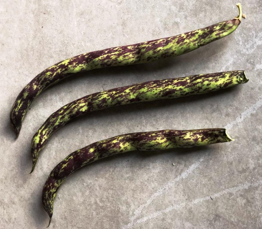 alte schwäbische Regionalsorte; Hülsen grün mit außergewöhnlich dunkelvioletten Sprenkeln; Körner mittelgroß, mittelbraun, oval mit dunkelroter Zeichnung; mittelspät; sehr ertragreich; hellviolette Blüten; Frisch- und Körnerbohne