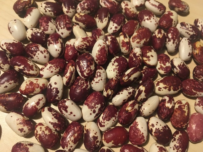 Reift nicht auf einmal, gute Ausbeute. Sie ähnelt etwas der "Mariazeller Bohne", welche jedoch meistens eine Stangebohne ist. Ich baue sie als Trockenbohne an, sie reift etwas spät mit großen dreifarbigen Kernen in weiß und roten Farben, drei Kerne pro Hülse.