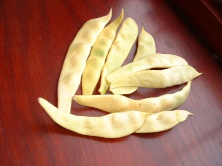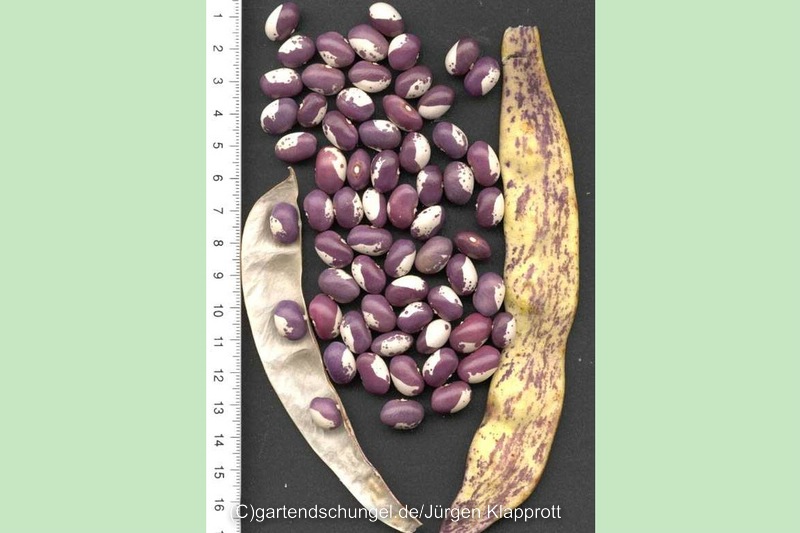 Mein Saatgut ist urspruenglich von Juergen Klapprott. Bohnen werden bis 20cm lang, flach und breit. Wohlschmeckend und attraktiv. Reift im September, Samenreife Oktober.