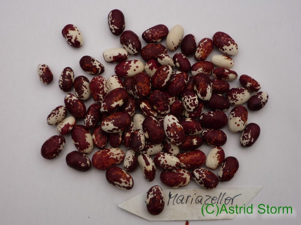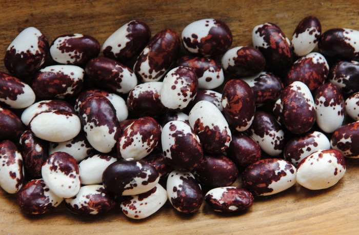 Körnerbohne, Palbohne Vereint Schönheit, Frühzeitigkeit und guten Ertrag in idealer Weise. Großes, ei-förmiges, herrlich weinrot-weiß gezeichnetes, dickliches Korn (15 x 7 mm). Dicke, grüne Hülsen. Vermut-lich zum Auslösen der halbreifen und reifen Körner. 15 Korn.