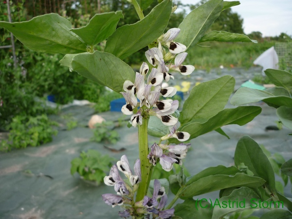 Puffbohne Maris Bead, uralte Sorte, die schon in 6000 v. Chr. gegessen wurde, Korn 5-10mm, Blüte weiß-schwarz mit blauen Streifen (Astrid Storm)