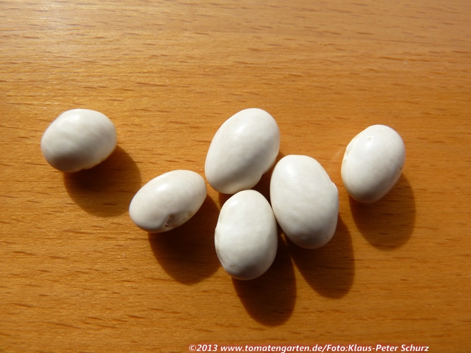 Samen eher kurz/gestaucht+oval, ovaler Querschnitt, Bauch gerade, Rücken konvex, Weißtöne. Mittlere Größe: 100 St. = 29 g.